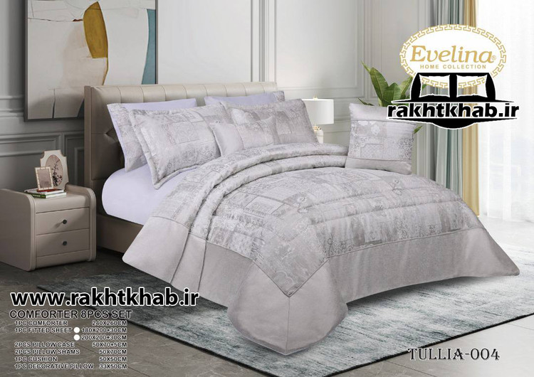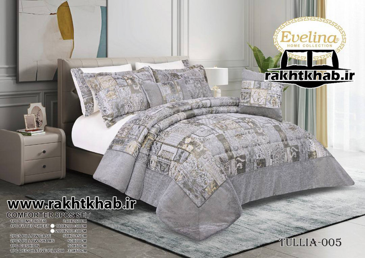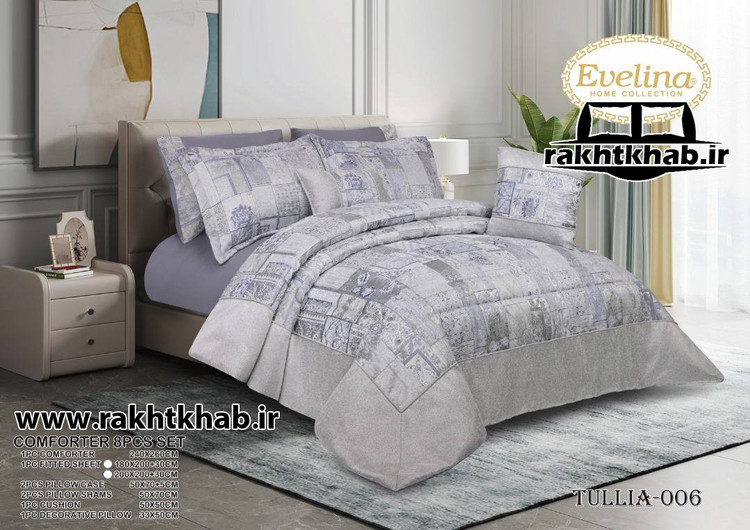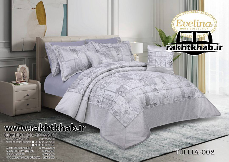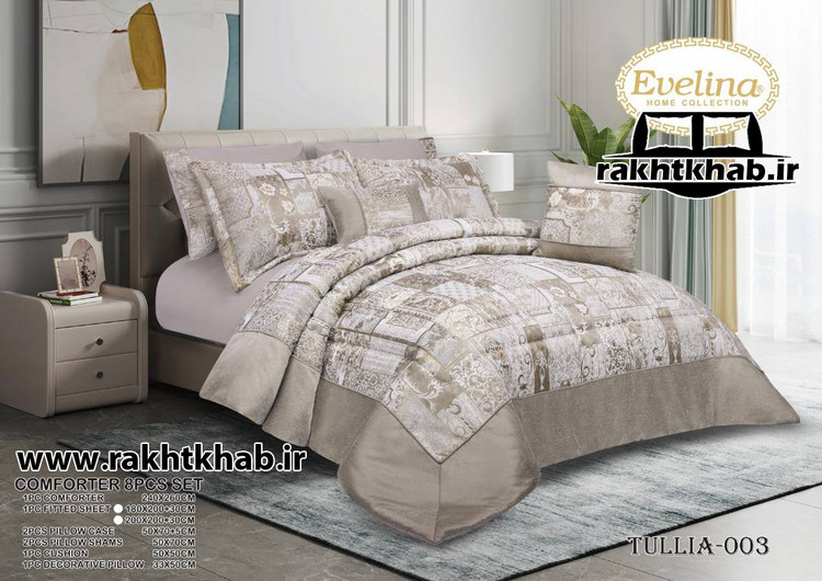 تعداد تکه: 8 تکه (1 عدد لحاف + 1 عدد ملحفه کشدوز تشک + 2 عدد روبالشی آکسفورد + 2 عدد روبالشی ساده + 2 عدد کوسن پر شده)